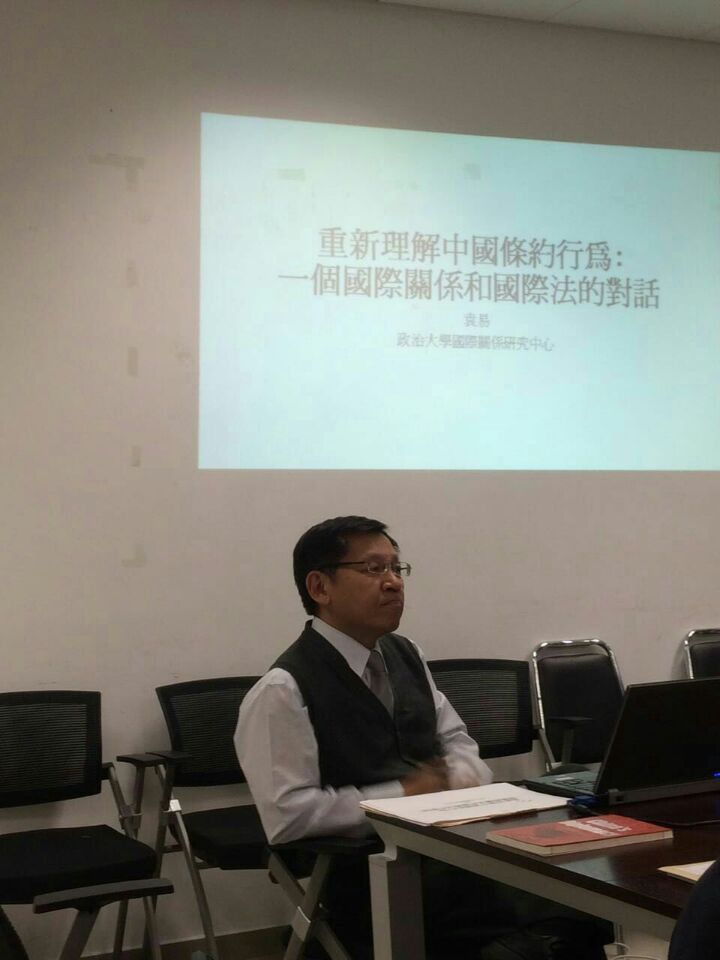 2015年11月18日(周三)15:30-17:30,北外国关前沿沙龙第二期活动在北京外国语大学西院综合楼举行。本次沙龙主题是“重新理解中国条约行为:一个国际关系与国际法的对话”。本次沙龙学术活动由袁易教授(台湾政治大学国际关系研究中心教授)主讲、尹继武老师(UED体育副教授)主持,并邀请王明进(UED体育教授、副院长)和张效民(UED体育副教授)两位老师作为评议人。本次沙龙吸引了来自北京外国语大学和中国人民大学的近二十名师生前来参加。