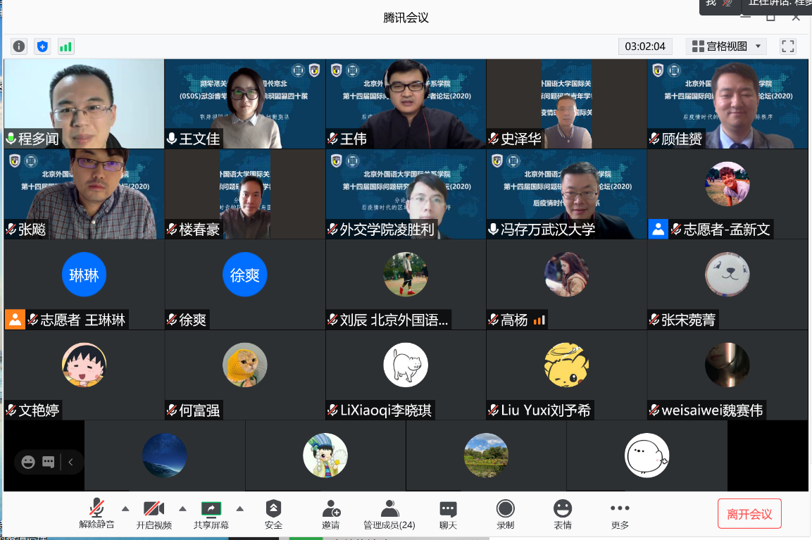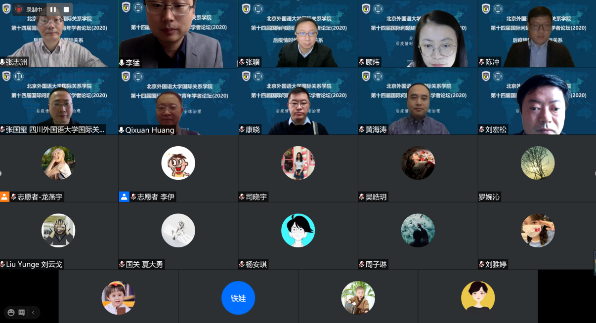 分论坛二以“后疫情时代的全球治理”为主题,由北外国关学院李猛老师主持,学者们围绕新冠疫情对全球武装冲突与政治暴力的影响、后疫情时代的比较地区秩序、美国全球地位的重建、世界政治经济的常态治理与危机治理、全球治理的困境与发展、二十国集团在全球治理中的作用、民粹主义领导能否战胜新冠病毒、疫情催化与结构性变革等问题进行了深入交流与探讨。北外国关张志洲教授、刘铁娃副教授分别对发言进行了精彩的点评。