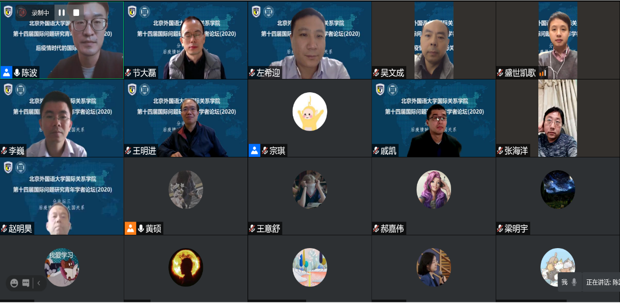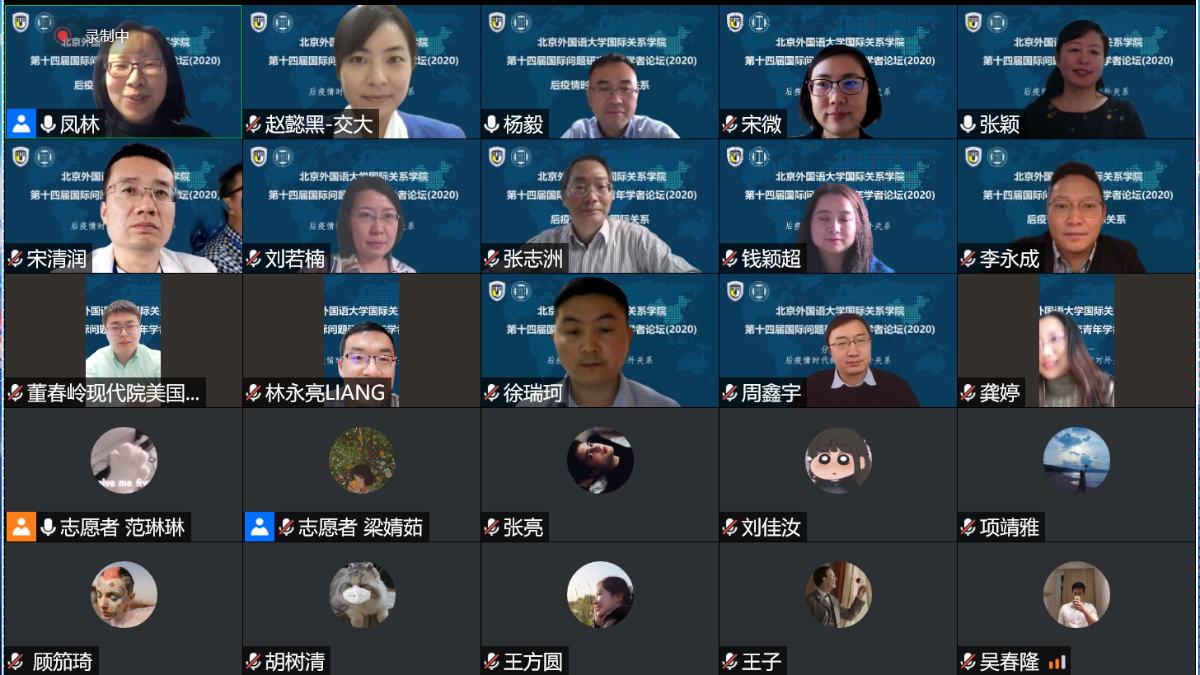 本次青年学者论坛共设四个分论坛,分论坛一主题为“后疫情时代的中国对外关系”,由北外国关学院的郭凤林老师主持。学者们围绕后疫情时代的中美关系与大国博弈、中国与东南亚安全关系、中国与南欧五国关系、中缅命运共同体建设、中国对非援助新模式、中国“一带一路”建设高质量发展新路、中国民间外交与国家形象提升等问题展开深入讨论,北外国关张颖教授、杨毅教授分别对发言进行了精彩的点评。