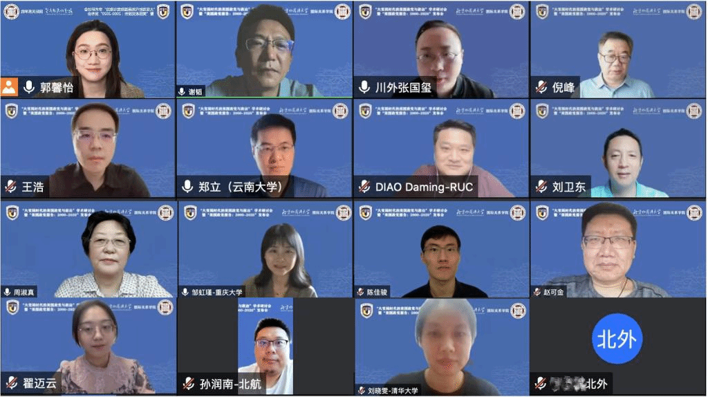 2022年7月25日,由UED体育主办的“大变局时代的美国政党与政治”学术研讨会暨“美国政党报告:2000-2020”发布会在线上召开。来自北京外国语大学、中国人民大学、清华大学、复旦大学、北京航空航天大学、云南大学、四川外国语大学、重庆大学、中共中央党校、中国社会科学院、上海市美国问题研究所等高校和研究机构的15位专家参加研讨会。