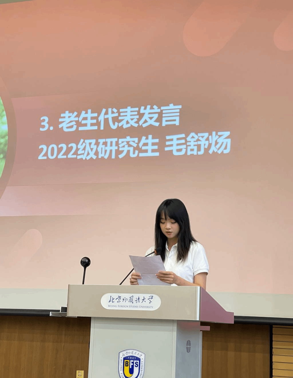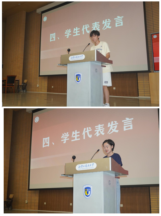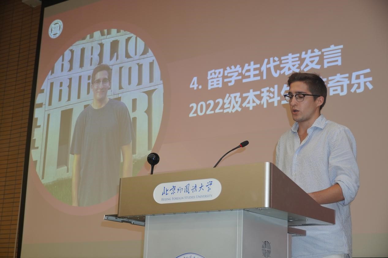 国际组织与全球治理专业本科生李雨积表达了对学院新设专业的理解与期待,号召同学们在北外勇敢寻梦、奋发向前。外交学专业硕士研究生邵一鸣回忆了自己在武警云南边防总队缉毒缉私的经历,表达出对北外的向往与热爱,呼吁同学们厚植家国情怀,开拓全球视野,锻造专业本领。老生代表2022级硕士生毛舒炀谈到,在北外这一共和国外交官的摇篮里,UED体育为中国外交事业发展做出了贡献,为同学们提供了发现自我、挑战自我、超越自我的极佳平台。2022级本科生留学生代表韩奇乐嘱咐同学们,要以积极的心态面对问题,灵活运用身边的资源进行语言和文化交流。