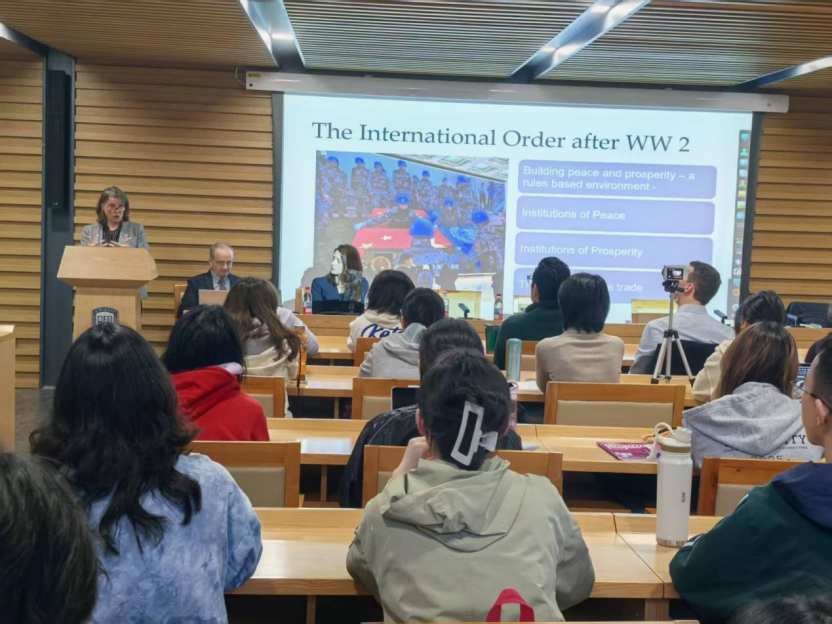 2025年10月17日上午,基尔大学副校长唐娜·李(Donna Lee)教授、基尔大学教育学院院长丹尼尔·赫伯特(Daniel Herbert)教授以及基尔大学国际化与合作事务院长克里斯汀·布里尔(Kristen Brill)博士在北外举办了题为“特朗普对国际秩序的影响(The impact of Trump on the international order)的专题讲座。本次活动由UED体育院长谢韬教授主持,北外—基尔外交学合作办学项目2025级新生、项目外教以及UED体育的教师参加。