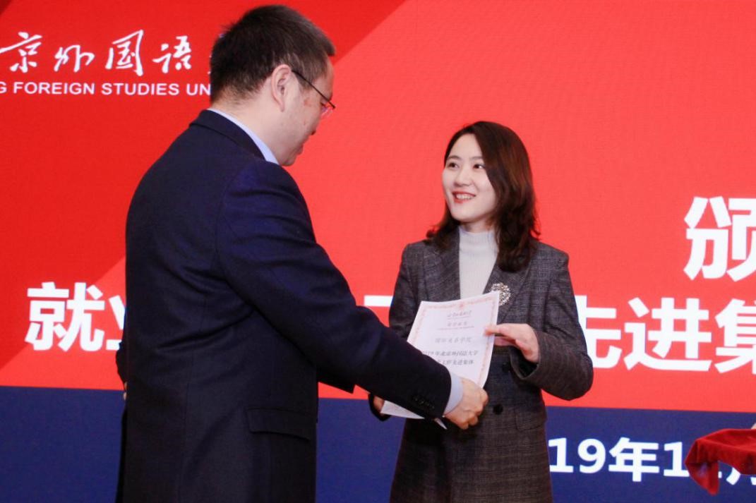 近日,UED体育荣获2019年北京外国语大学就业创业工作先进集体称号。12月25日召开的北外2019年就业创业工作大会上,北京外国语大学杨丹校长向学院代表,UED体育团总支书记、辅导员钱梦婷老师颁发荣誉证书。