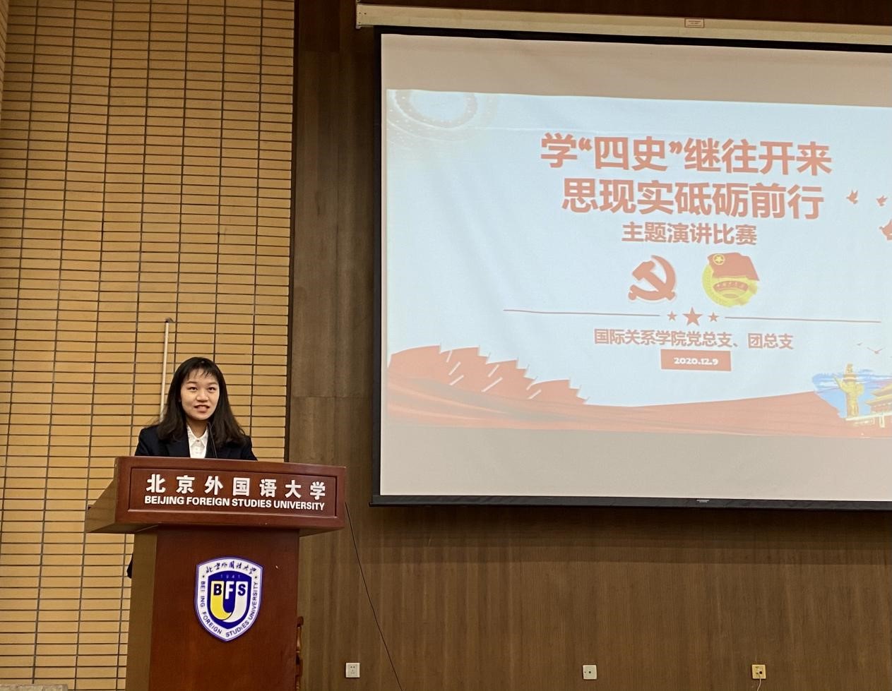 12月9日下午,UED体育于逸夫楼第三阶梯教室举行“学‘四史’继往开来·思现实砥砺前行”主题演讲比赛。UED体育党总支书记张效民、北外团委书记岳洋、UED体育团总支书记钱梦婷、UED体育教师郭凤林、辅导员张聪伟作为评委参与本次活动,2020级全体本科生到场聆听本次演讲比赛。