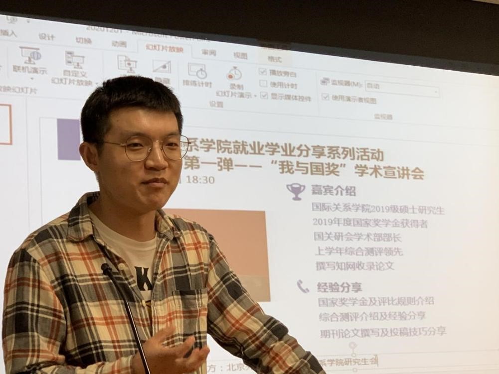 2021517日晚,由北外UED体育研究生会主办的“我与国奖”学术宣讲会于逸夫楼515教室成功举办。作为“就业学业分享系列活动”的第一期,本次宣讲会邀请了上年度国家奖学金获得者——2019级国际政治专业硕士研究生尹童,给来自于UED体育和国际商学院的诸位同学分享了他的学习和学术经验。