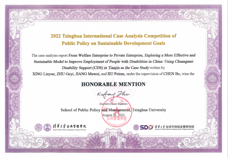 我院学生聚焦“从福利企业到私营企业,探索更加有效和可持续的模式促进残疾人就业:以创美模式为例”(From welfare enterprise to private enterprise, exploring a more effective and sustainable model to improve employment of people with disabilities in China: using Chuangmei Disability Support (CDS) in Tianjin as the case study),通过探访天津创美助残基地,了解我国目前最新的推动残疾人就业模式,在陈波老师的指导下,从残疾人就业现状、就业政策变迁调整、企业助残困境、创美助残模式等角度进行案例研究,并提供建议。