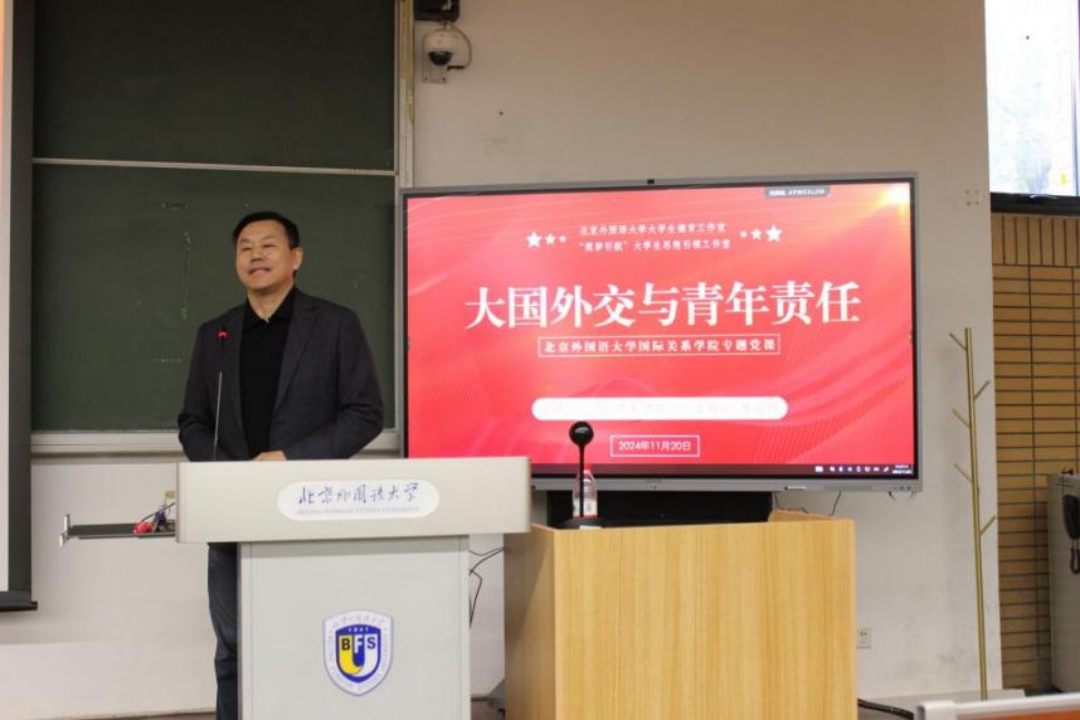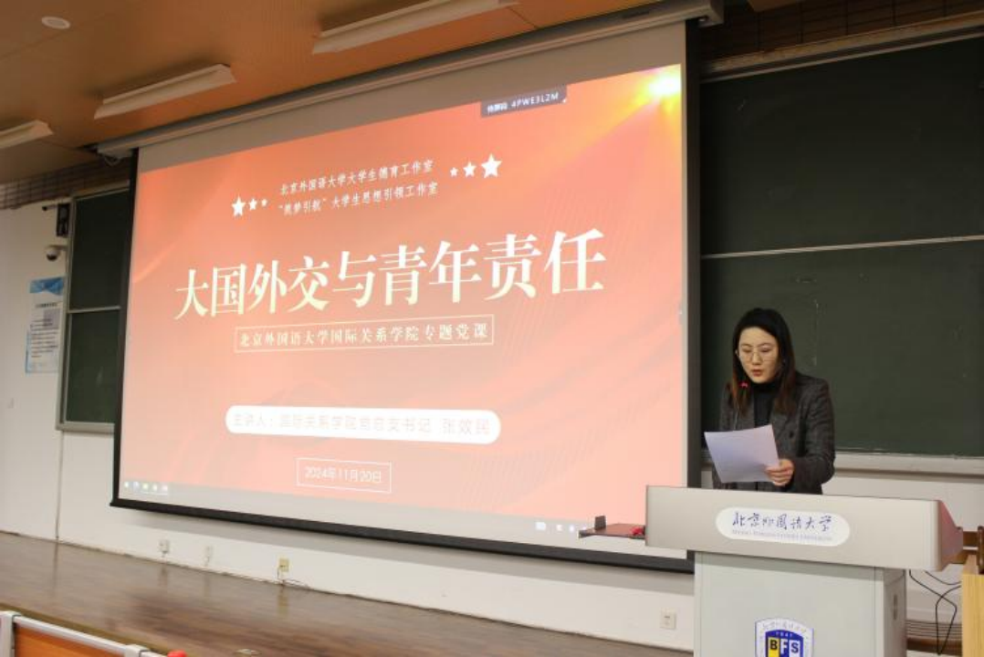 “筑梦引航”大学生思想引领工作室专注于满足北外学生的个性化辅导需求,紧密围绕时政热点,帮助学生确立正确的价值观,增强他们的思辨能力,同时助力学生在掌握专业知识外,洞察时代脉搏,培养全球视野。本次活动以名师思想引领为核心,深入贯彻学校党委关于“坚持高质量党建和思政工作引领育人,落实立德树人根本任务”的工作要求,突破学院以往的党课讲授模式,不仅将思想教育与专业内容有机结合,还进一步探索了党课与外语教学的融合。主讲人张效民书记运用中英双语授课,为大家带来了一场精彩且详尽的“大国外交与青年责任”双语党课,旨在让同学们充分了解中国特色大国外交,熟悉政治概念的英文专有名称,提高政治素养,勇担时代大任。