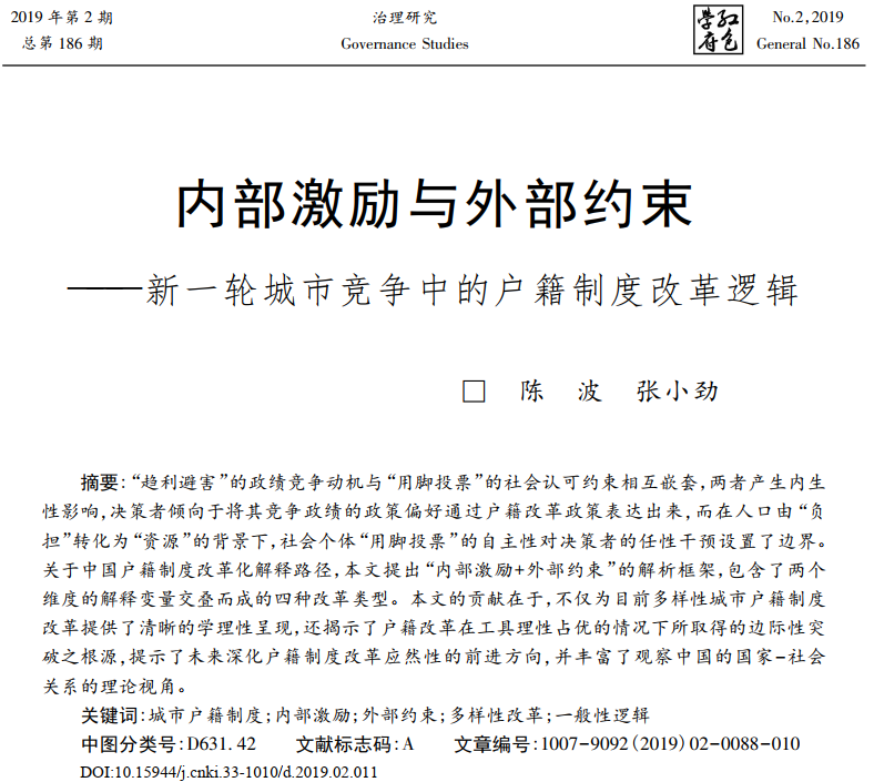 UED体育教师陈波以第一作者在CSSCI期刊《治理研究》发表论文:《内部激励与外部约束——新一轮城市竞争中的户籍制度改革逻辑》,论文摘要和原文链接如下: