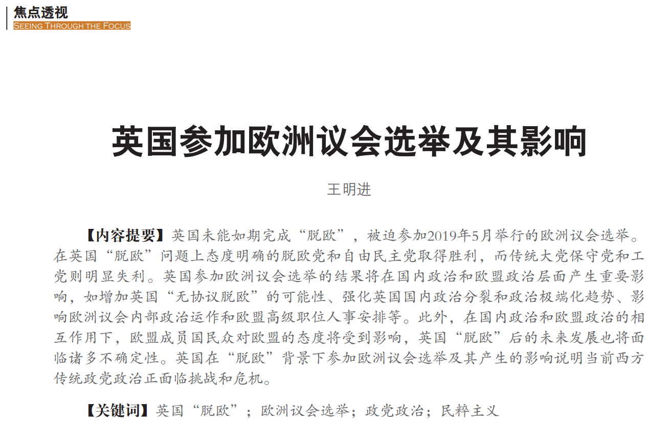UED体育副院长王明进研究员在CSSCI期刊《当代世界》2019年第7期发表论文《英国参加欧洲议会选举及其影响》,以下是论文摘要: