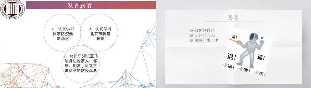 2020级硕士生孙冕分享了自己如何向家人、邻居、朋友们传播防疫知识,引导大家树立正确科学的防疫观念,并表示:“我认为疫情防控事关每一位公民,要清楚地认识到当前国内外疫情防控的复杂性、艰巨性、反复性,作为入党积极分子,必须以强烈的责任感和使命感,深入学习领会,保持战略定力,坚决巩固疫情防控重大战略成果,以实际行动迎接党的二十大顺利召开。”