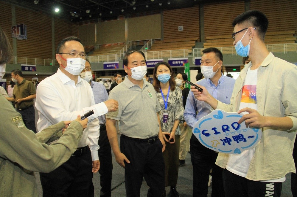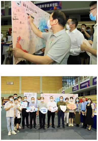 UED体育党总支书记张效民、院长谢韬、副院长张颖、党总支副书记彭澍以及团总支书记、辅导员钱梦婷到工作现场慰问工作人员,并和前来报到的新生合影留念。