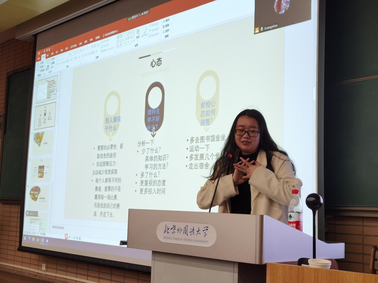 第一位分享人为2021级外交学专业本科生王梦竹。首先,王梦竹同学从如何平衡学习、社团活动与社会实践的角度,建议大一新生要从心态上接受大学生身份的转变,接受自己的改变。为了不让自己陷入焦虑和精神内耗,她建议学弟学妹通过做很多不一样的事情,让自己忙起来,从而没有时间去焦虑,去找到自我价值,而不是无所适从。