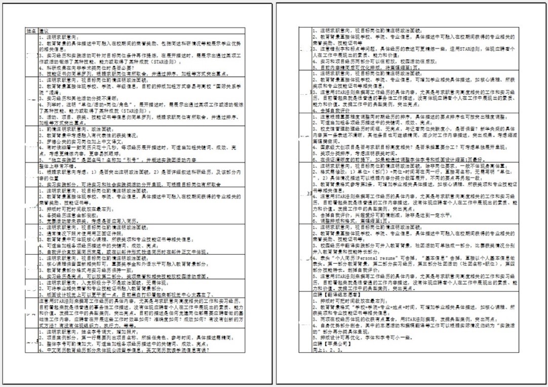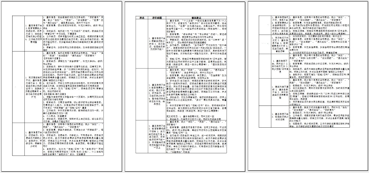 本期活动中,同学们的专业背景更加多元化,简历内容也更加丰满。老师们肯定同学们简历中的亮点,也发现了一些普遍性的问题,如:求职意向未能明确标注、板块划分不够明确、教育背景等信息未能按照时间顺序排列、关键词不够突出、经历和技能介绍缺乏与求职意向的关联性等等。希望同学们认真地参考老师们的修改意见,让简历更专业、更亮眼,助力同学们拿到心仪的offer!