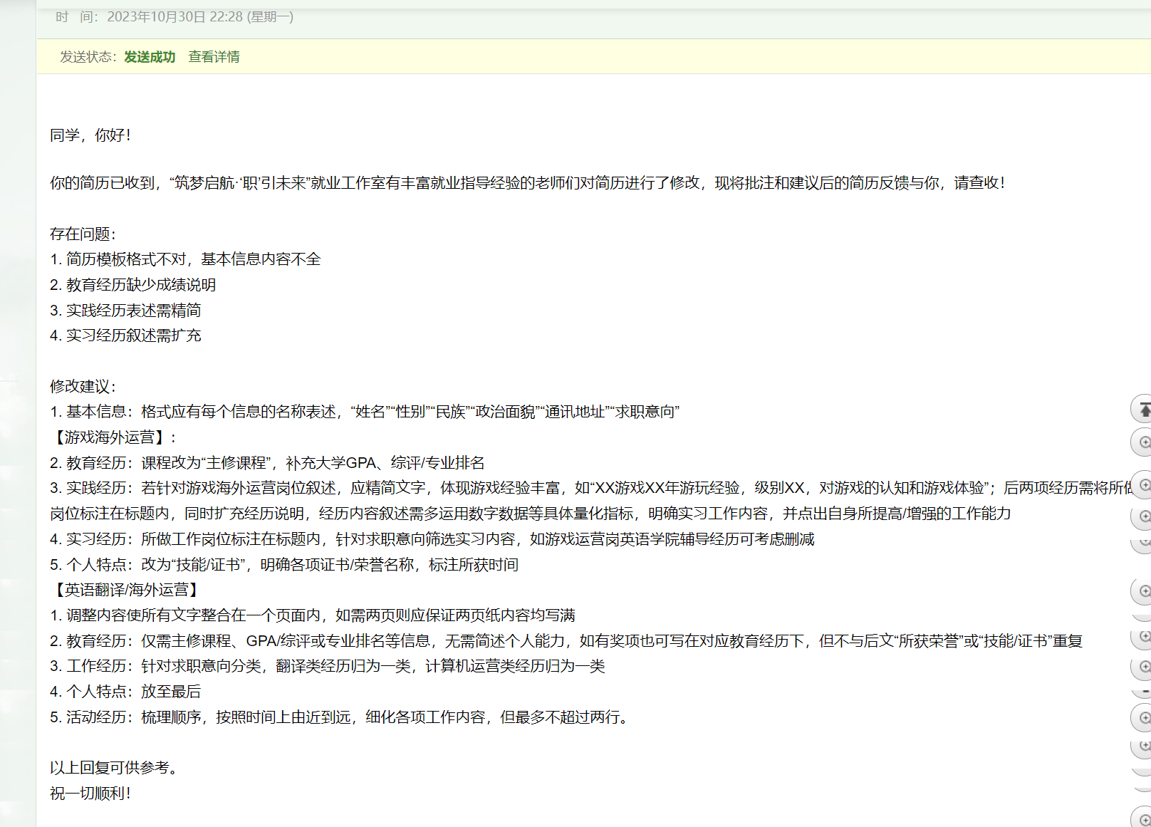 本次活动经工作室团队的精心筹备,由法学院辅导员刘时剑,阿拉伯学院辅导员杨一凡,UED体育辅导员钱梦婷、褚静璇对同学们的简历进行细致详尽的修改,汇总成完善的修改建议,最终由工作室团队以邮件形式向同学们提供“一对一”的反馈。