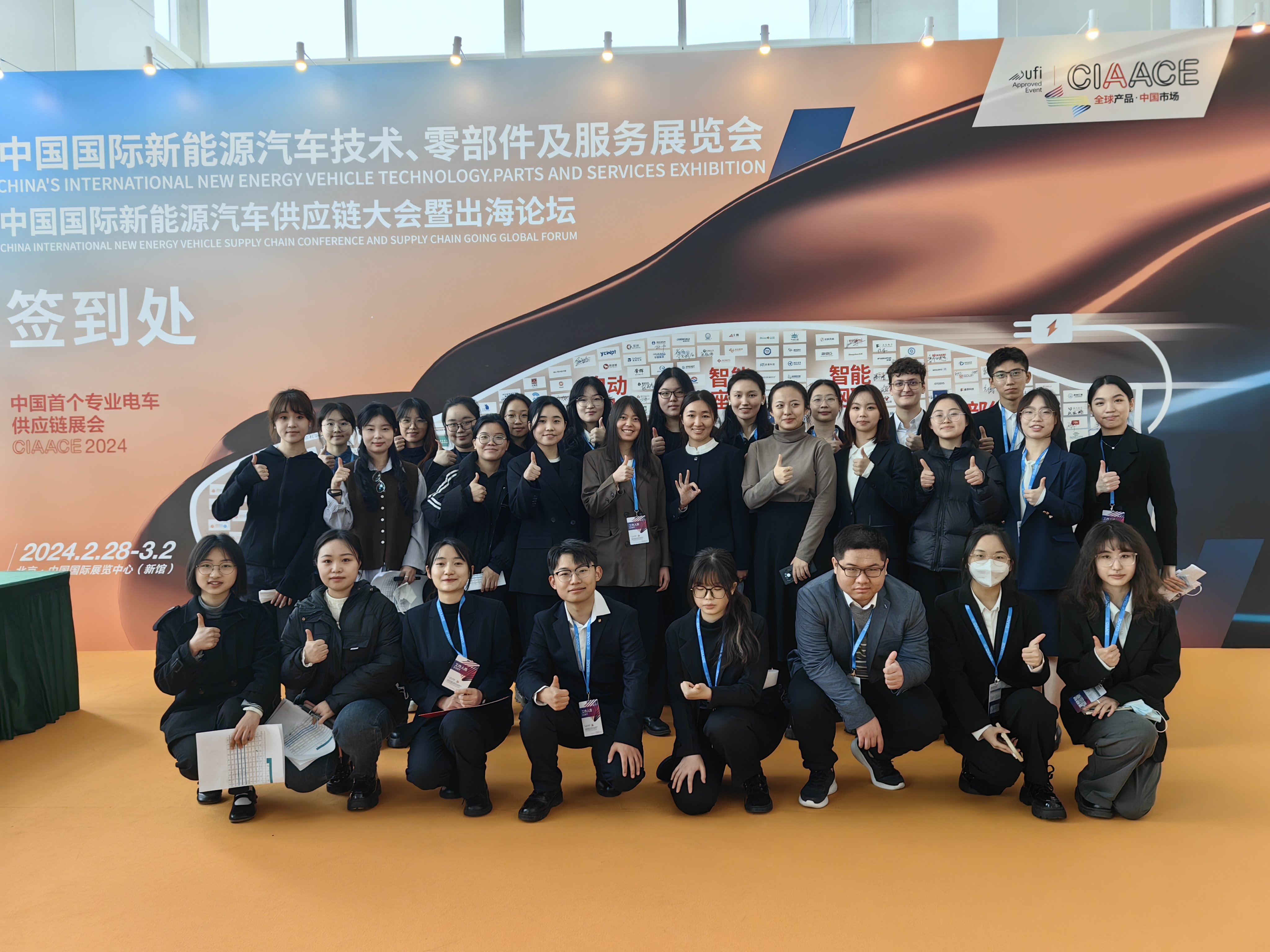 2024年2月28日,UED体育33名学生志愿者赴北京顺义中国国际展览中心,参与第2届中国国际新能源汽车供应链大会志愿服务活动,在外宾接待、翻译陪同、引导服务等岗位上挥洒青春汗水。