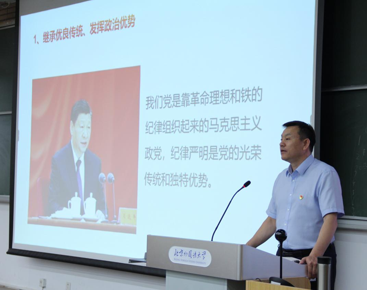 张效民书记结合学院专业特点,着重强调了《中国共产党纪律处分条例》中的政治纪律,提醒学生要时刻坚守正确的政治立场,不断提高政治站位,坚决做到“两个维护”,在意识形态斗争中保持清醒的头脑。