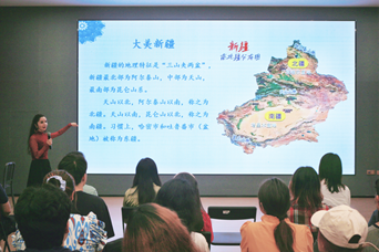 活动伊始,古丽米娜教授及来自中央民族大学的同学介绍了新疆地区的基本概况与风土人情,从地理特征、风景名胜、民族文化、服饰民俗、特色美食等方面全方位展现了新疆的独特风情与迷人魅力。
