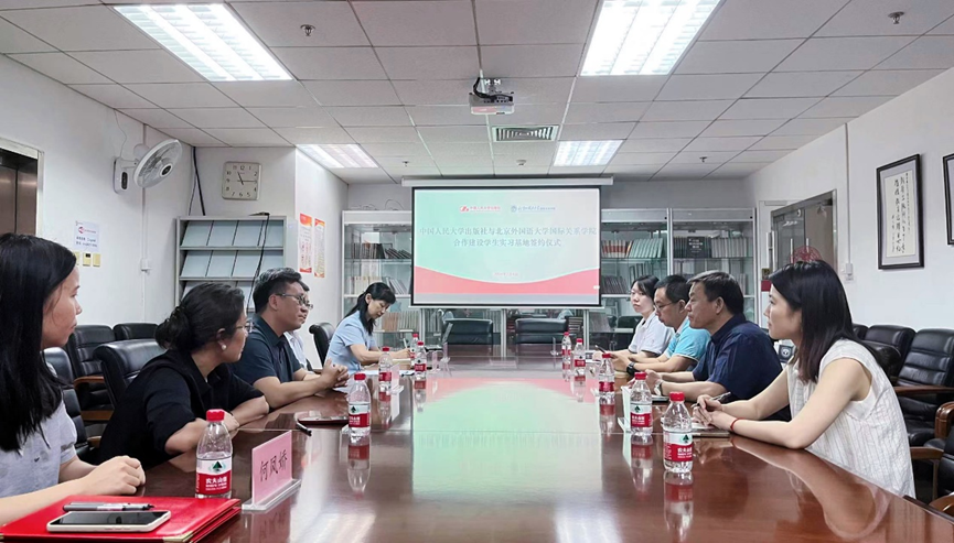李开龙总经理首先介绍了人大出版社发展现状,强调了对与北外国关学院合作建设实习基地的高度重视。王磊副总经理介绍了人大出版社人才队伍建设及人才培养现状。随后,北外国关学院张效民书记介绍了学院的整体情况及学生培养体系,副书记彭澍介绍了学院学生特点,组织员钱梦婷介绍了学生就业工作情况。双方就推动实习基地建设、助力国际出版人才培养等方面展开深入讨论。